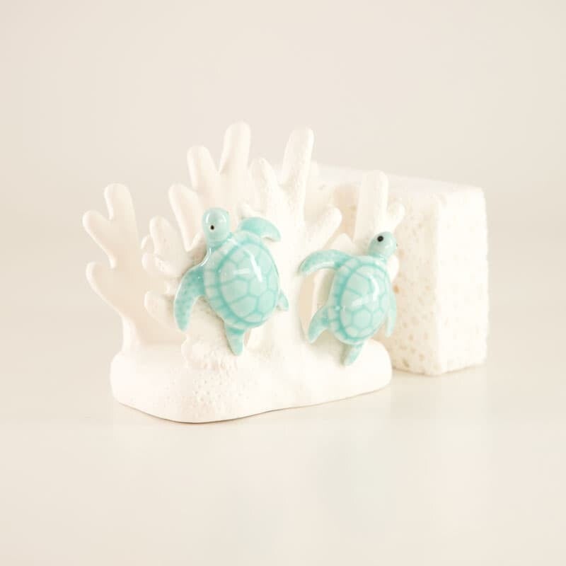 Our Ceramic Turtle Sponge Holder with Sponge brings a charming ocean inspired touch to your sink area with its pair of green turtles resting against coral shaped details. The included sponge fits neatly in the center making this piece both decorative and functional for everyday use.